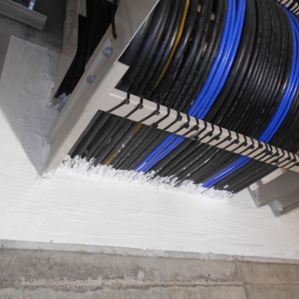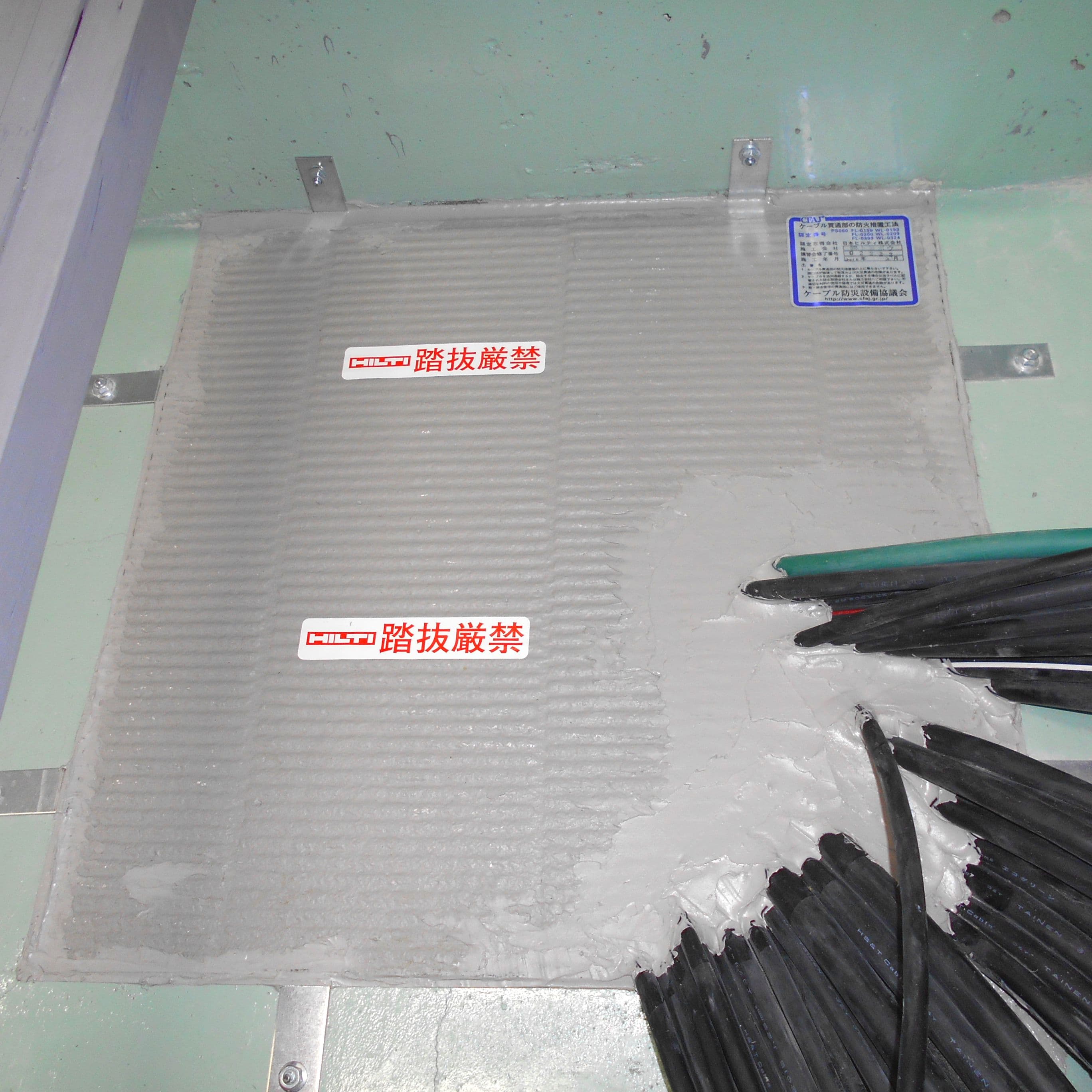 従来より広く使用されている工法です。ケーブル又はケーブルラックの形状に加工したケイカル板を取付、耐熱シール材で塞ぐ工法です。開口の形状に問わず、複雑なケーブルの貫通処理にも対応でき、仕上りが綺麗になる工法です。