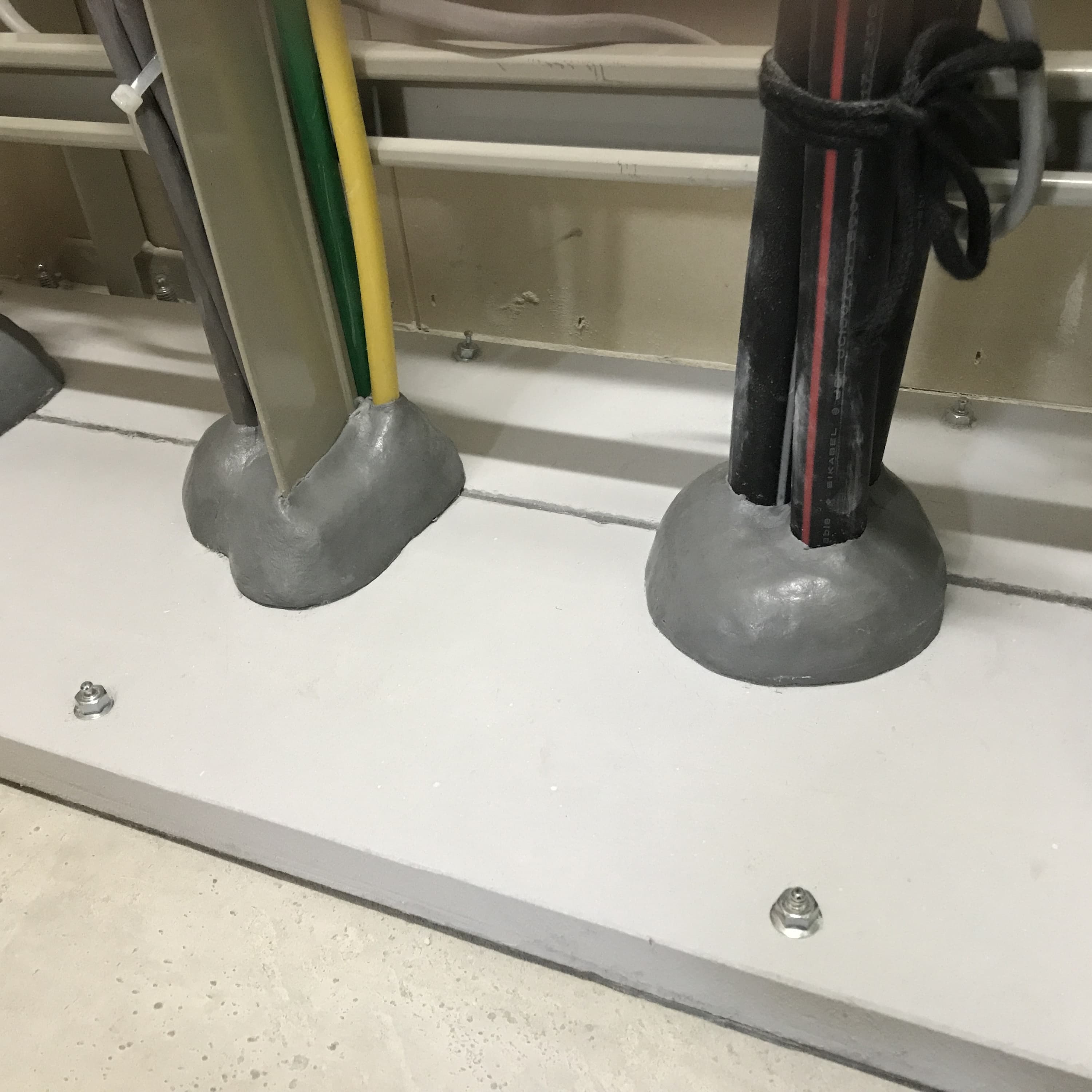 従来より広く使用されている工法です。ケーブル又はケーブルラックの形状に加工したケイカル板を取付、耐熱シール材で塞ぐ工法です。開口の形状に問わず、複雑なケーブルの貫通処理にも対応でき、仕上りが綺麗になる工法です。