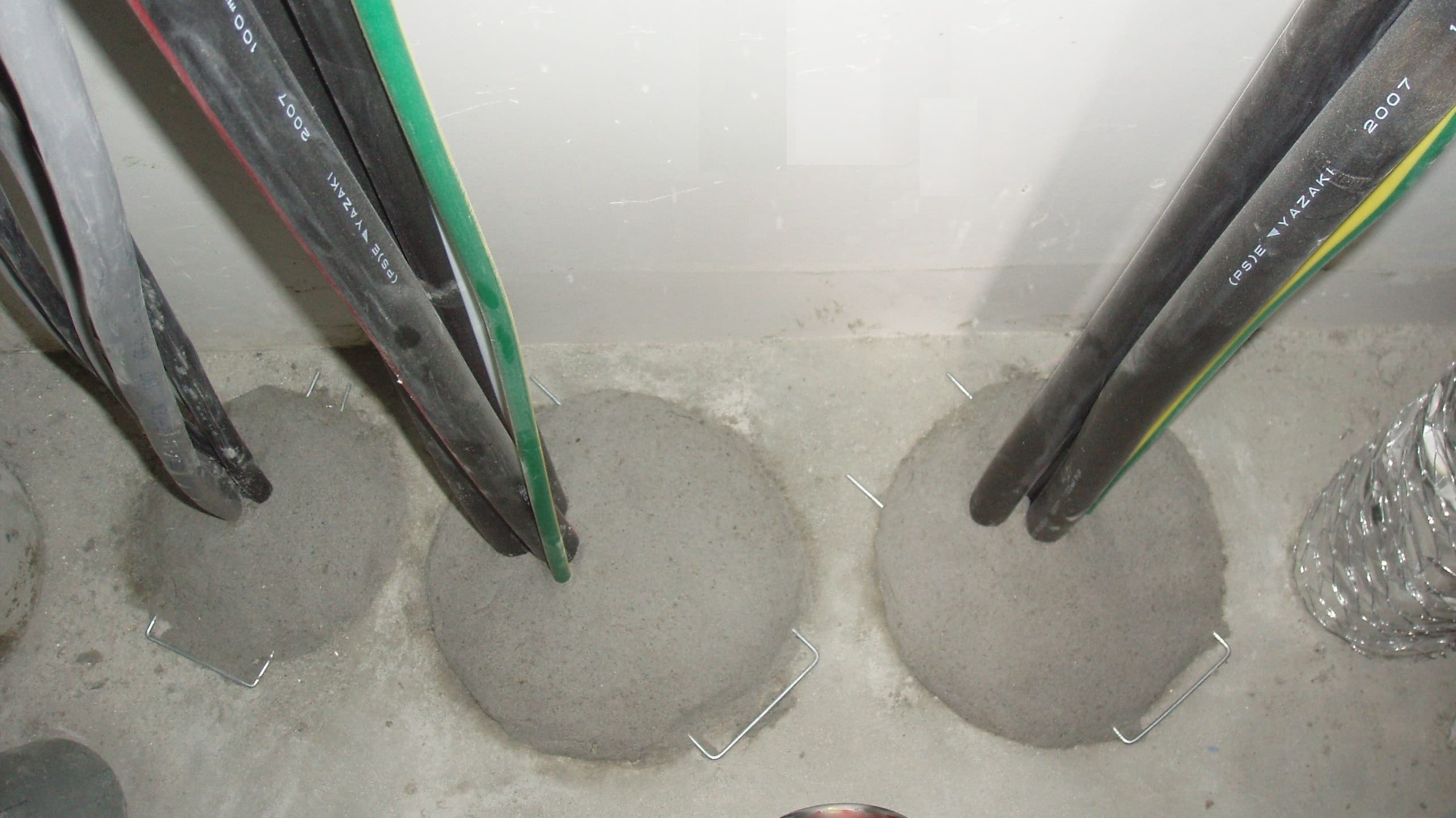 壁床貫通部共に施工後は一体化し、意匠的にも優れた工法です。ロックウールボードを開口、ケーブル又はケーブルラックに沿って加工し、充填後シーラントにて隙間を埋めます。遮音性、耐水性や経年劣化にも強い工法です。